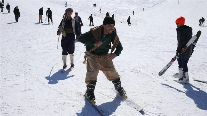 Şemdinli'nin Aşağı Kayalar köyünden gelen gençler de giydikleri yöresel kıyafetler ve tahta kayak takımlarıyla festivali renklendirdi.