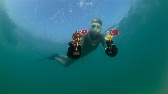 Erken, daha sonra tüpsüz dalış gerçekleştirdiği yüzeyi kısmen buzla kaplı gölde, Zara ilçesinin yöresel bez bebekleriyle su altında poz verdi.