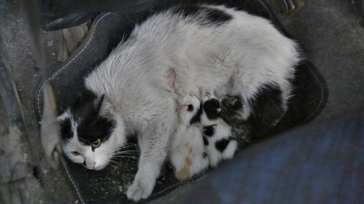 İş yerinde servis için kullandığı otomobilden gelen sesler üzerine aracı kontrol eden Mucazoğulları, ön ve arka koltuk arasında bir kedinin 4 yavru doğurduğunu gördü.