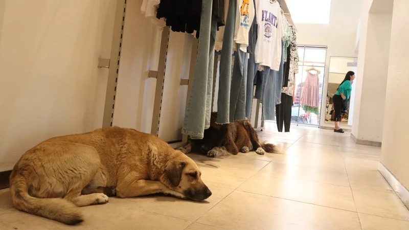 Caddedeki klimalı iş yerlerine giren hayvanlar, bir köşede yatarak serinliyor. Müşteriler, genellikle uyuyan hayvanları rahatsız etmemek için dikkatli şekilde yanlarından geçiyor, bazıları da sahipsiz köpekleri seviyor.