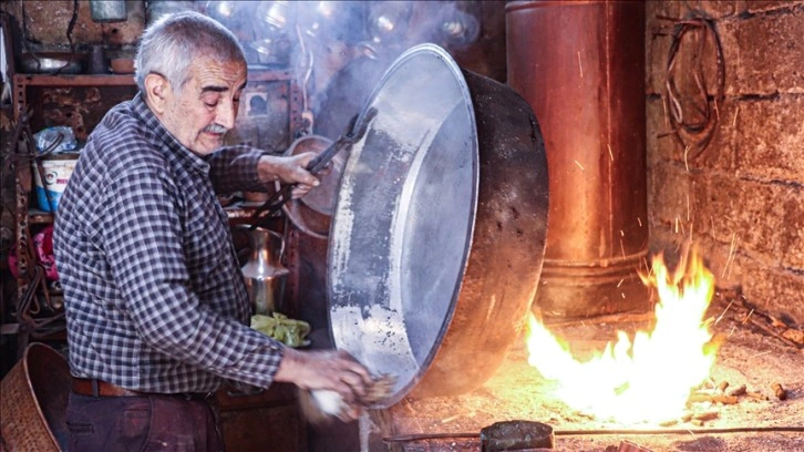 Müşterilerin getirdiği mutfak eşyalarını geleneksel yöntemlerle kalaylayarak yeni görünüme kavuşturan Bakır, her yıl biraz daha önemini yitiren mesleği ilerleyen yaşına rağmen yaşatmaya çalışıyor.