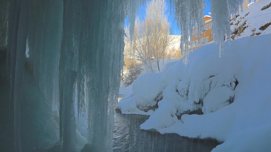 Bayburt'ta, Divanyolu Dağları ile Kırklar Tepe eteklerinden doğduktan sonra Kopuz Deresi'nden yaklaşık 20 metreden dökülen Sırakayalar Şelalesi buz tuttu.
