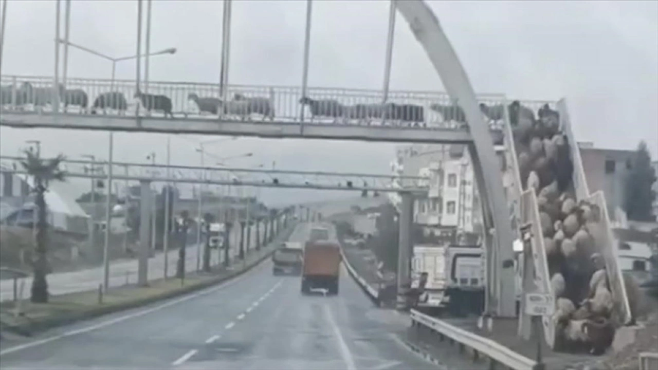 Hayvanlarını otlatmak isteyen bir çoban, yolun karşısına güvenle geçirmek istediği sürüyü üst geçide yönlendirdi.
