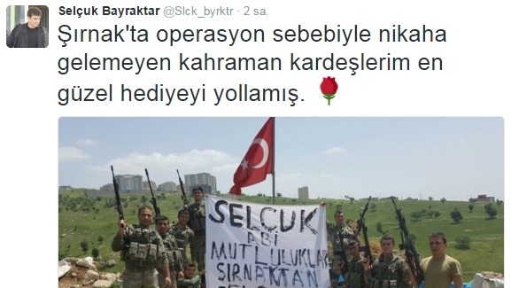 “Selçuk abi mutluluklar, Şırnak’tan selamlar Bursa/JÖH” ifadelerinin yer aldığı fotoğrafa Selçuk Bayraktar şu notu düştü: “Şırnak’ta operasyon sebebiyle nikaha gelemeyen kahraman kardeşlerim en güzel hediyeyi yollamış.”