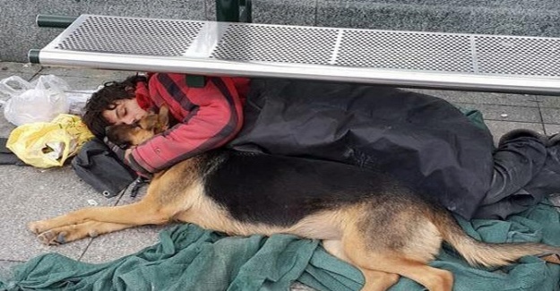 Evsiz bir genç ile sokak köpeğinin soğuk havadan korunmak için bir durakta birbirlerine sarılarak uyuduğu ana ait fotoğraf karesi herkesi duygulandırdı.