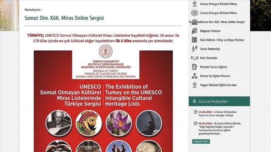 Kültür ve Turizm Bakanlığından yapılan yazılı açıklamaya göre, toplumsal farkındalığı artırmak amacıyla Türkiye'nin UNESCO Somut Olmayan Kültürel Miras Listelerine kaydedilen 18 somut olmayan kültürel miras unsurunun, Türkçe ve İngilizce olarak kısaca tanıtıldığı online sergi, "https://aregem.ktb.gov.tr/TR-243105/somut-olm-kult-miras-online-sergisi.html" adresinde izlenime sunuldu.