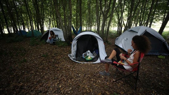 Yeni tip koranavirüs (Kovid-19) salgını döneminde Düzce'nin Gölyaka ilçesinde Kuyudüzü mevkisindeki kamp alanında buluşan Türkiye'nin çeşitli illerinden 50 aile, tedbirlere uygun düzenlenen etkinliklerle doğada olmanın keyfini çıkarıyor.