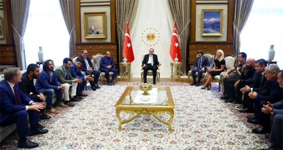 Cumhurbaşkanlığı Külliyesi'nde basına kapalı gerçekleşen kabulde, Türkiye Futbol Federasyonu Başkanı Yıldırım Demirören, TFF 1. Başkanvekili Servet Yardımcı, Türkiye Futbol Direktörü Fatih Terim, Kulüpler Birliği Vakfı ve İstanbul Başakşehir Futbol Kulübü Başkanı Göksel Gümüşdağ, A Milli Takım oyuncusu Arda Turan, Milli Takım eski oyuncusu ve spor yorumcusu Rıdvan Dilmen ile bazı sanatçı ve televizyoncular hazır bulundu.