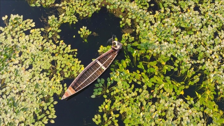 Bazı mahalle sakinleri ve ziyaretçiler, gölü adeta "işgal eden" ve yeşile boyayan su sümbüllerinin arasında tahta sandallarla gezip balık avlıyor.