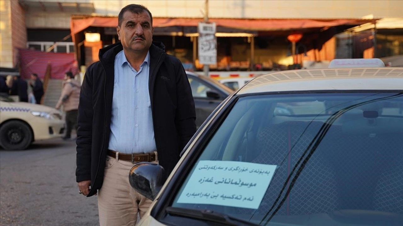 Süleymaniyeli taksici Abdülkerim, aracının camlarına “Gazzeli Müslümanların direnişi ve başarısı için bu taksi bedavadır" şeklinde pankart astı.