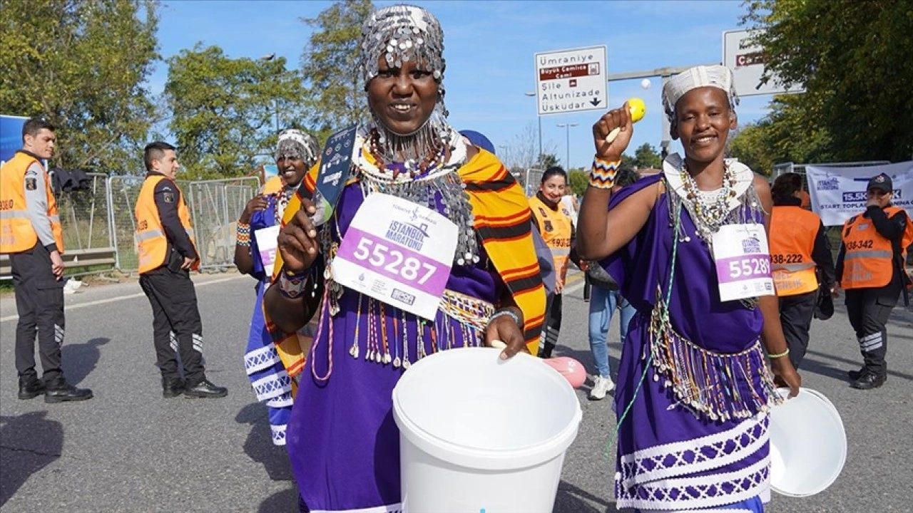 Kendilerine özgü kıyafetleri giyen Masailer, ellerindeki su kovalarıyla ülkelerindeki su krizine dikkati çekti. Maratondaki koşucular da etkinliğe alkışlarla destek oldu.