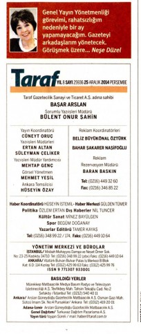 Taraf gazetesinin '25 Aralık tarihli sayısında, gazetenin Genel Yayın Yönetmeni Neşe Düzel'in ismi künyede yer almadı.