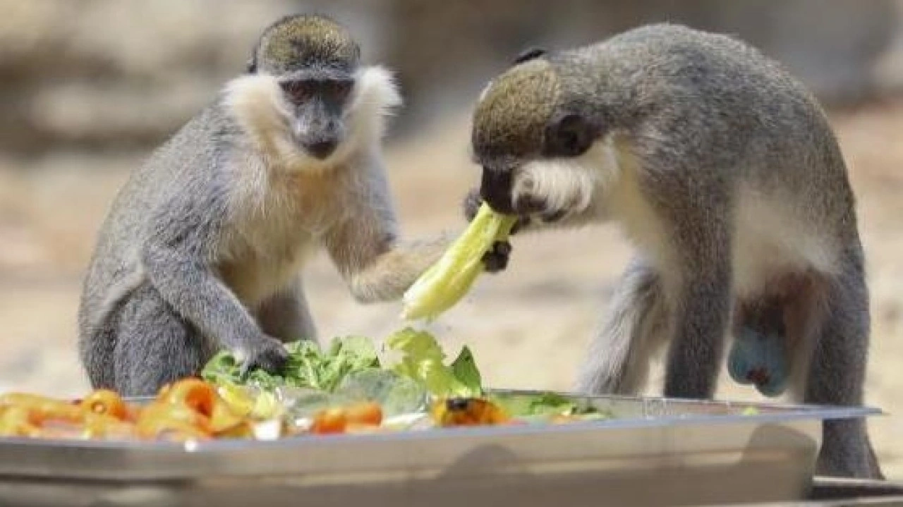 Ekipler, lemur ve maymunların tüketmesi için buzlu meyve kokteyli hazırlıyor.