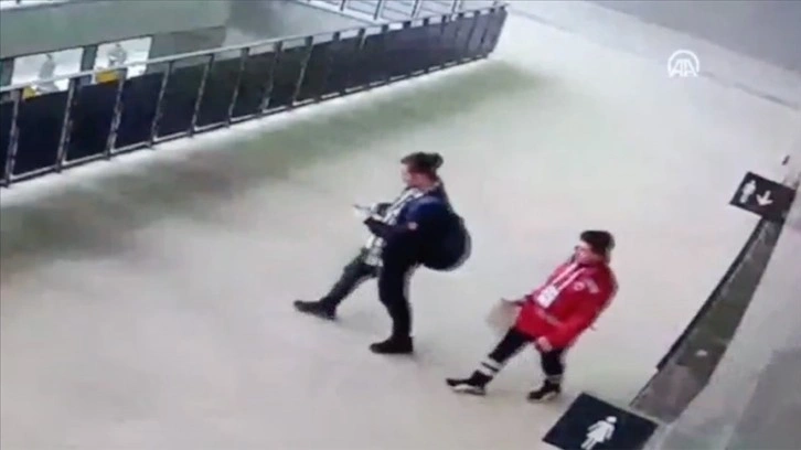 Görüntülerde güvenlik personelini geçerek sırt çantasıyla misafir tribünün tuvaletlerine giren şüphelilerin bir süre sonra çıkarak telefonla konuştukları görülüyor.