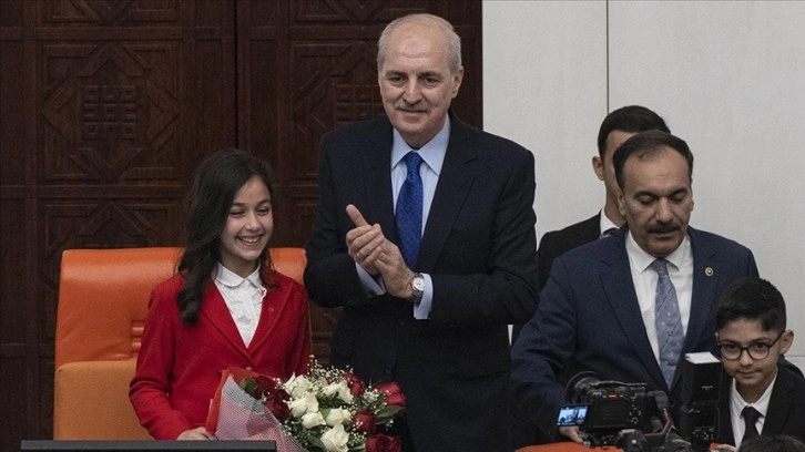 Genel Kurul Salonu'nda ağırladıkları çocuklara işaret eden Numan Kurtulmuş, "'Hakimiyet kayıtsız şartsız milletindir' düsturu altında inşallah aranızdan çok sayıda evladımızın gelecekte bu Meclis çatısı altında ülkeyi yöneteceğini biliyoruz. Hepinize başarılar diliyorum." diye konuştu.