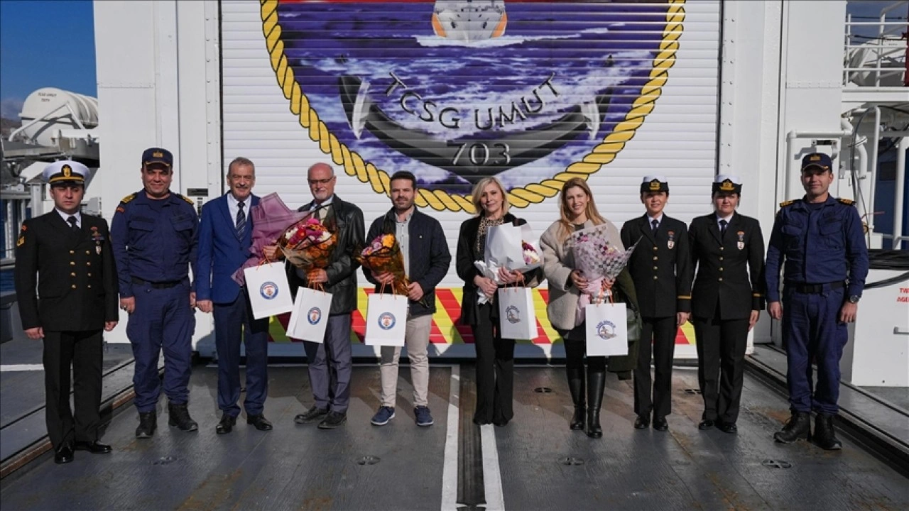 Alsancak Limanı'nda demirleyen gemide Sahil Güvenlik Ege Deniz Bölge Komutanı Tuğamiral Tayfun Paşaoğlu ve beraberindeki heyet, konukları karşılayarak bilgi verdi.