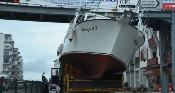 "Serap 57” adındaki gezi teknesi suya indirilmek üzere vinç üzerinde sahile taşınırken Gelincik mevkisindeki üst geçide çarptı. Üst geçidin altından geçmeye çalışırken sıkışan tekne, sürücünün müdahalesiyle kurtarılarak yoluna devam etti.
