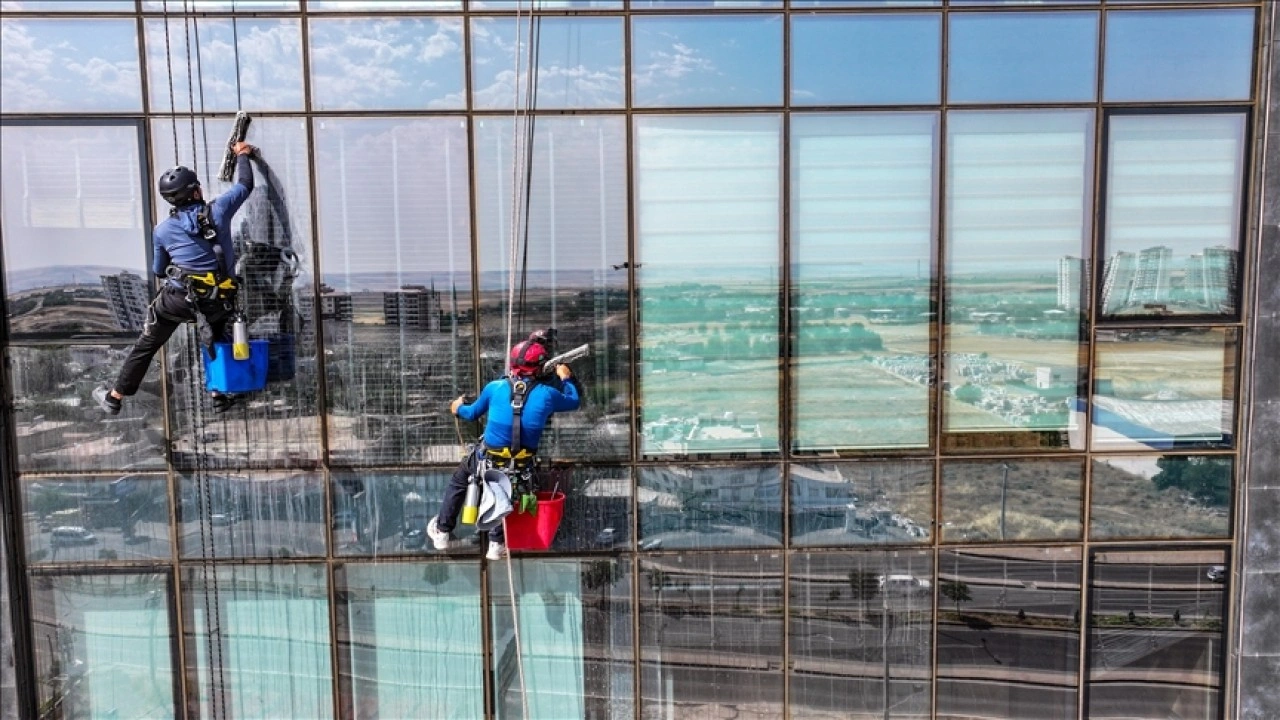 Yaz aylarında sıcaklığın 40 dereceyi aştığı, zaman zaman toz bulutunun etkili olduğu kentte yüksek katlı binaların dış cephe cam temizliğini yapan gençlerin mesaisinin büyük bölümü havada halatlara asılı geçiyor.