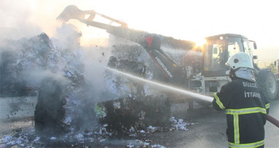 Olay TEM Otoyulu Kaynaşlı mevkiinde sabah saatlerinde meydana geldi. Ankara’dan İstanbul istikametine gitmekte olan Musa Üzümcü idaresinde ki 34 AP 5495 plakalı tırın dorsesinin arka lastiklerinden bir anda yenmeye başladı. Durumu fark eden diğer sürücüler tarafından tır sürücüsü uyarılarak durdurulurken sürücü hemen dorse ile kupayı birbirinden ayırdı. Lastik kısmından yanmaya başlayan hurda kağıt yüklü tır bir anda alev topuna döndü. İtfaiyeye haber verilmesi üzerine olay yerine gelen Düzce Belediyesi İtfaiye Müdürlüğü ekipleri ve Karayolları Tünel iftaiyesi ekipleri yangını kontrol altına aldı. Sıkılan suya rağmen kağıtlar için için yanmaya devam etti. Yangını tamamen söndürmek için karayollarından kepçe geçirilerek tır’ın yükü tamamen boşaltıldı ve söndürüldü. Yangın nedeniyle uzun süre tem otoyolu istanbul istimatine tek şeritten verildi. Yangın ile ilgili inceleme başlatıldı.