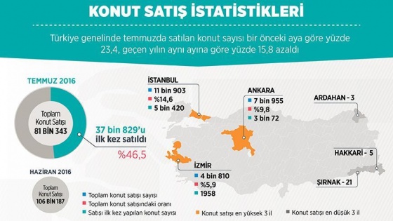 Türkiye genelinde ilk defa satılan konut sayısı, temmuzda geçen yılın aynı ayına göre yüzde 13,3 azalarak 37 bin 829 oldu. Toplam konut satışları içinde ilk satışın payı yüzde 46,5 olarak belirlendi. İlk satışlarda İstanbul 5 bin 420 konut satışı ile en yüksek paya (yüzde 14,3) sahip olurken, İstanbul u 3 bin 72 konut satışı ile Ankara ve bin 958 konut satışı ile İzmir izledi.