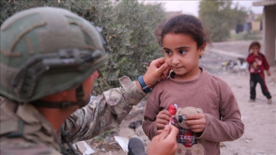 Mehmetçik, Suriye'nin kuzeyinde Barış Pınarı Harekatı ile kontrol altına alınan yerleşim birimlerinde savaş mağduru çocukların yüzünü güldürüyor.