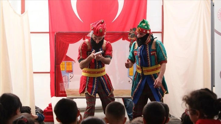 Hatay ve Kahramanmaraş'ın ardından Adıyaman'da gönüllü olarak sahne alan iki arkadaş, çadır kentlerde kurulu alanlarda çocuklar için her gün Hacivat-Karagöz oyununu sahneye koyuyor.
