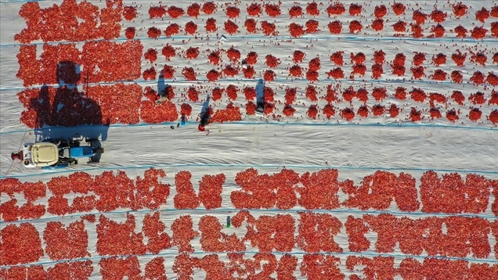 Tarım işçileri tarafından ikiye bölünerek örtülerin üzerine sıralanan domatesler, müşteri talebine göre kükürtlü veya tuzlu olarak 1 hafta güneş altında bekletilerek kurutuluyor.