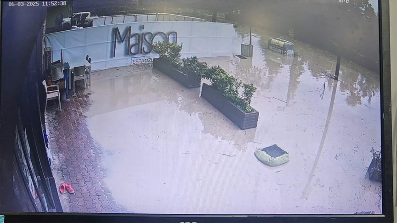 Öte yandan taşkın sırasında yolda suyun yükselme anı, Beşirli Mahallesi'ndeki bir iş yerinin güvenlik kamerasınca kaydedildi.