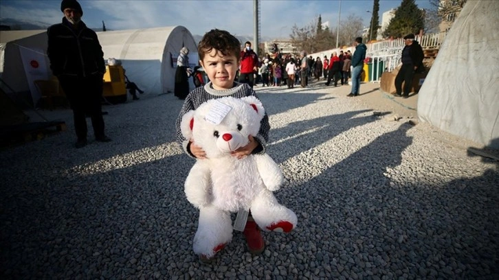Üzerindeki notlarla Kahramanmaraş'a ulaşan oyuncaklar, 12 Şubat Stadyumu'na kurulan çadır kentte çocuklara hediye edildi.