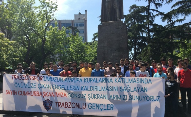 Trabzon Meydan Parkı’nda toplanan Trabzonlu Gençler, açtıkları pankart ile Trabzonspor’un UEFA ile yaşadığı süreçte bordo-mavili kulübe destek olan Cumhurbaşkanı Recep Tayyip Erdoğan’a teşekkür etti. Grup adına açıklama metnini okuyan Adem Sögüt, "Trabzonspor, 2016 yılılında UEFA’nın Fair Play anlaşması kurallarını ihlal ettiği gerekçesiyle şartlı olarak disiplin yaptırımı önerisiyle UEFA kontrol organı (CFCB) tarafından şartlı olarak disiplin yaptırımı önerisiyle CFCB yargı dairesine sevk edilmiş ve Avrupa kupalarından men cezasıyla karşı karşıya kalmıştır. Trabzonspor gibi 52 yıllık geçmişe sahip bir futbol kulübünün Avrupa kupalarına katılamaması hem Trabzonlu hemşehrilerimizi derinden üzecekti hem de Türk futbolu açısından büyük bir kayıp olacaktı. Trabzonspor’un Avrupa kupaları önündeki engel Cumhurbaşkanımız Recep Tayyip Erdoğan’ın devreye girmesi ile artık aşılmıştır. Trabzonlu Gençler gurubu olarak Cumhurbaşkanımız Recep Tayyip Erdoğan’a, Trabzon’umuza ve Trabzonspor’umuza verdiği değer için şükranlarımızı sunuyor, Avrupa kupalarında ülkemizi temsil edecek olan Trabzonspor’umuza başarılar diliyoruz" ifadelerini kullandı.