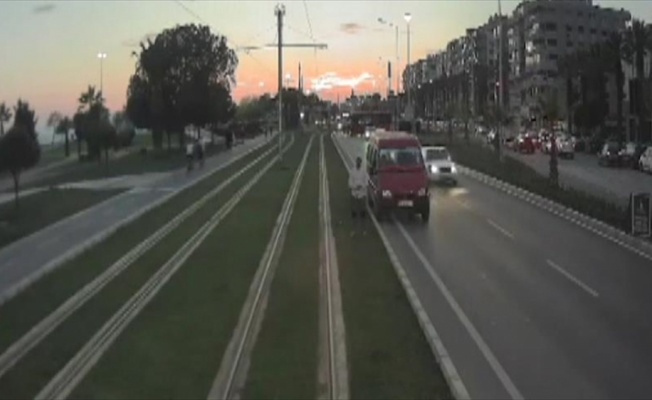 Sosyal medyada ilgi gören görüntülerde, kırmızı renkli minibüsünü parkeden bir kişi Alaybey Karşıyaka Tramvay hattında namaz kılıyor. Durumu farkeden vatman tramvayı durduruyor. Tramvayın geldiğini farkeden kişi de aceleyle namazını bitiriyor. Ardından yola park ettiği minibüsüne binerek uzaklaşıyor.