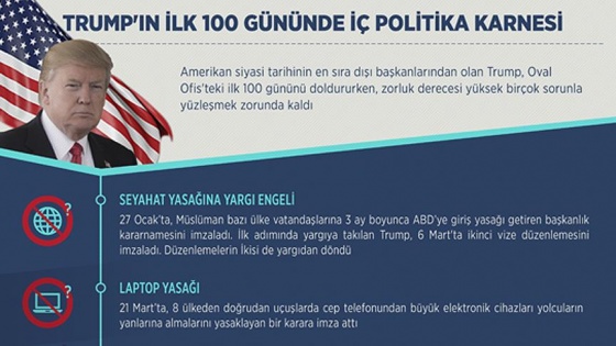 Beyaz Saray'da ilk 100 gününü tamamlayan ABD Başkanı Donald Trump, "nüfusunun çoğunluğu Müslüman bazı ülke vatandaşlarına seyahat yasağı", "Rusya'nın başkanlık seçimlerine müdahale ettiği iddiaları", "Ulusal Güvenlik Danışmanı Michael Flynn'in istifası", "Meksika sınırına duvar" ve "ana akım Amerikan medyasıyla yaşadığı gerilim" gibi ana başlıklar etrafında tansiyonu yüksek bir dönem geçirdi.