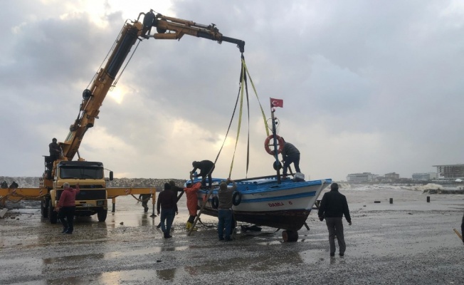 Antalya’nın Alanya ilçesinde balıkçılar, balıkçı teknelerini fırtınadan kurtarmak için vinç yardımıyla karaya çıkardı.