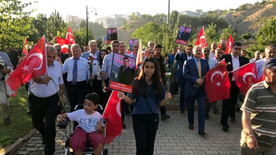 İl merkezindeki Cumhuriyet Caddesi'nde toplanan çok sayıda kişi, ellerinde şehit öğretmen Yılmaz'ın fotoğrafı üzerinde "sen bizim şehidimiz ve onurumuzsun" yazılı posterler ile Türk bayrakları ve karanfillerle yürüyüşe geçti.