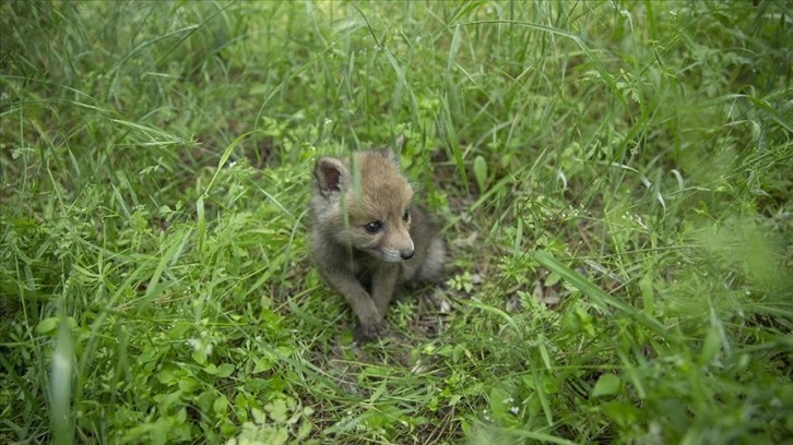 Ekiplerce açık alana çıkarılan tilki yavrusu, otların arasında geziniyor.