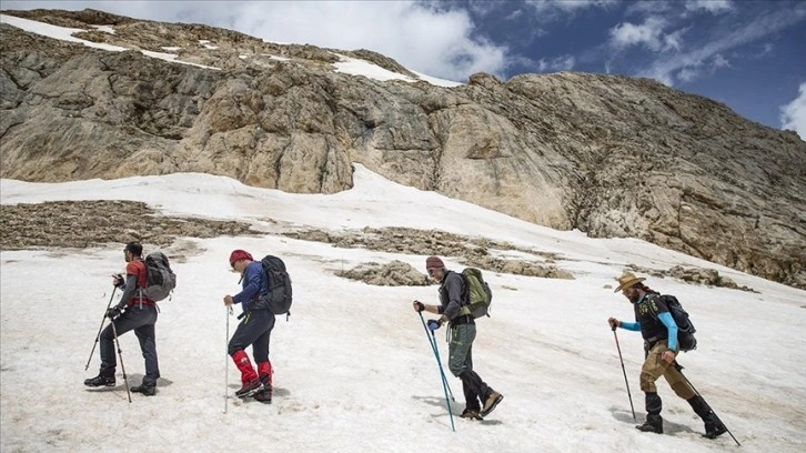 Saatler süren zorlu tırmanışlarla hedeflerine ulaşan dağcılar, rotaları boyunca bahar ve kış güzellikleri arasında vakit geçiriyor.