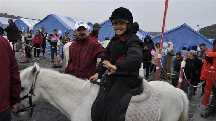 Antakya ilçesi Küçükdalyan Mahallesi'ndeki çadır kentte çocukları atlarla buluşturan TJK, boyama kitapları ve oyuncaklar da dağıttı.
