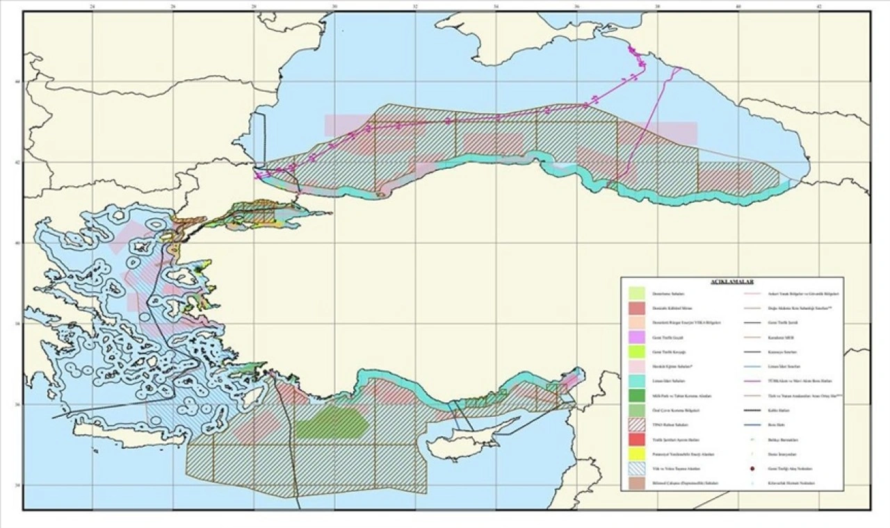 Haritada, Türkiye'nin DMP'si kapsamında çevre denizlerinde karasularının da ötesine geçerek ekonomik, bilimsel ve askeri faaliyetler için planlamalar yapıldığı ve bu faaliyetler için belirli alanlar tespit ettiği görülüyor.