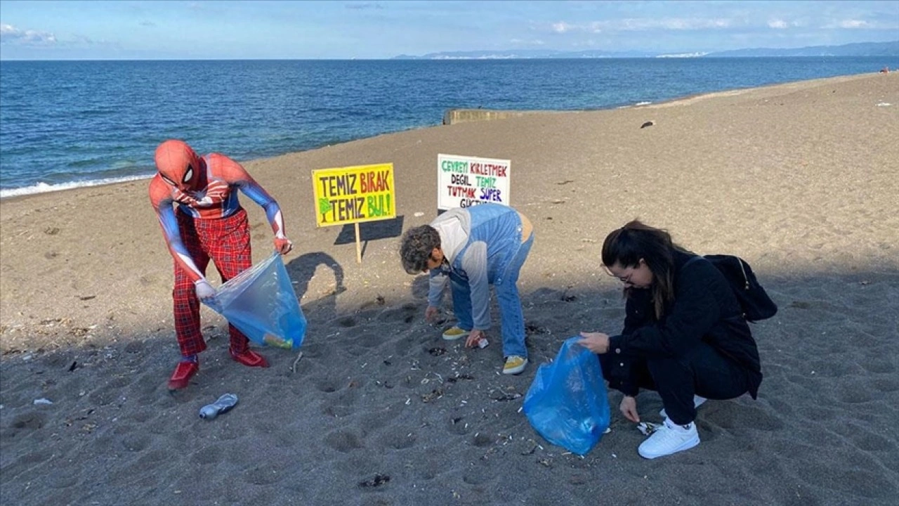 "Örümcek Adam" kostümüyle çevre temizliği yapan Koç'a, gençler ve çocuklar da destek verdi.