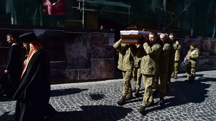 Peter ve Paul Kilisesi’ndeki törene katılan Lvivliler, 38 yaşındaki askerin tabutunu diz çökerek uğurladı.