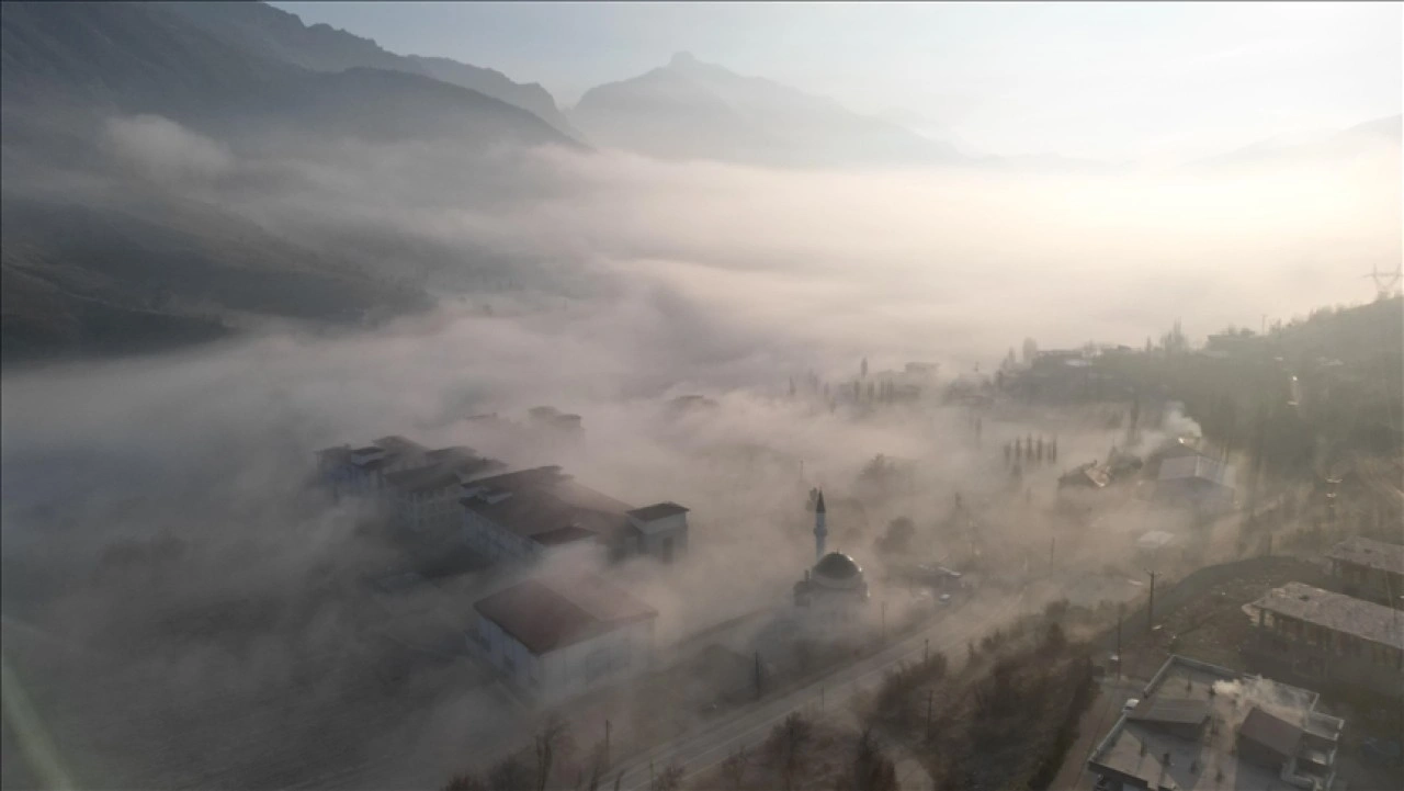 Yerleşim yerleri ve dağların bir bölümünü kaplayan sis, dronla görüntülendi.