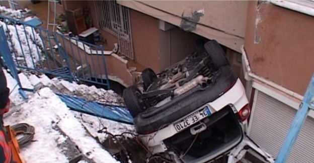 Ümraniye’de seyir halindeki otomobil, yolun buz tutması nedeniyle kontrolden çıkarak, bir anaokulunun yanında bulunan binanın boşluğuna düştü.