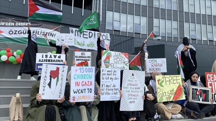 Boyunlarına kefiye takıp, ellerinde Filistin ve Türk bayrağı ile Kelime-i Tevhid yazılı bayrak taşıyan öğrenciler Türkçe, İngilizce ve Arapça pankartlarla oturma eylemini sürdürdü.