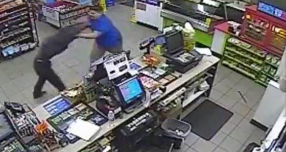 Amerika Birleşik Devletleri’nin Teksas eyaletinde bir markete giren eli sopalı soyguncu, kasaya yöneldi ve paraları almaya başladı. Tam bu sırada soyguncunun üzerine atlayan çalışansa, adamı yaka paça dışarı attı.