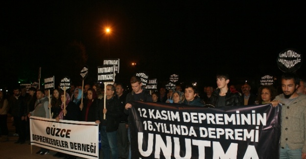 16 yıl önce 7.2 büyüklüğündeki depreminin meydana geldiği saat 18.58’e kısa bir süre kala Düzce Depremzedeler Derneği üyeleri, ellerinde taşıdıkları ’Depremi Unutma, Unutturma’ yazılı dövizlerle slogan atarak Anıtpark’a geldi. Grup, deprem saatinde ise 2 dakikalık saygı duruşunda bulundu.