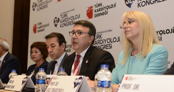 TKD ve Kongre Başkanı Prof. Dr. Mahmut Şahin, kalp damar hastalıklarının dünya ve Türkiye’deki son durumu ile ilgili bilgiler paylaştı. 1963 yılında kurulan ve 53 yıllık birikimi olan Türk Kardiyoloji Derneği’nin misyonunun ’Toplumsal mesleki eğitimi ve araştırmaları destekleyerek Türk halkının kalp damar sağlığını korumak’ olduğunu ifade eden Prof. Dr. Mahmut Şahin, "9 risk faktörü yani kolesterol yüksekliği, sigara, diyabet, hipertansiyon, karın tipi şişmanlık, psiko-sosyal stres, kötü beslenme, fiziksel hareketsizlik ve alkol ilk kalp krizi için riskin yüzde 90’ından fazlasından sorumludur. Bunlar önlenebilir veya düzeltilebilir durumlardır. Avrupa ülkelerine göre Türkiye’de kalp krizi erkek ve kadınlarda 10 yıl daha erken ortaya çıkmaktadır. Avrupa’da erkeklerde 55, kadınlarda 65 yaşında yoğunlaşan kalp krizi ile hastaneye yatışlar, bizde erkeklerde 45-55, kadınlarda 55-65 yaşlarında zirve yapıyor. Bu yüzden her bireyin kalp damar hastalığına yakalanmadan en az 65 yaşına gelmesi misyonumuz olmalıdır" dedi.