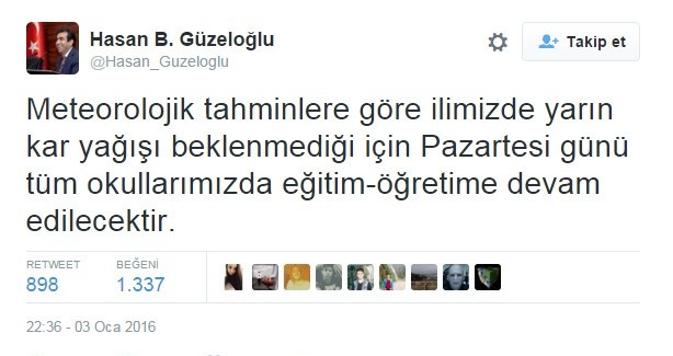 Kocaeli Valiliği’ne ait resmi Twitter hesabı ele geçirildi. Akşam saatlerinde hesabın çalınmasının ardından Kocaeli Valiliği’ne ait resmi hesaptan saat 21.48’de "Buzlanmalar ve oluşturabileceği tehlikeler nedeniyle, 04.01.2016 Pazartesi günü Kocaeli ili genelinde eğitim ve öğretime ara verilmiştir" şeklinde tweet atıldı. Sosyal medyada Kocaeli Valiliği’nin resmi hesabından yapılan açıklamayı gören öğrenciler adeta bayram ederken, bazı okullar da öğrenci velilerine okulların tatil olduğu yönünde mesaj attı.Kocaeli Valiliği’nin resmi hesabından atılan bu tweetin üzerinde yaklaşık 1 saat geçmesinin ardından Kocaeli Valisi Hasan Basri Güzeloğlu’nun kişisel hesabından atılan başka bir tweet ise gerçeği ortaya çıkardı. Vali Güzeloğlu’nun kişisel hesabından, "Valiliğimiz web sitesi ve resmi Twitter hesaplarına yapılan siber saldırılarla sahte tatil bildirimleri yapılmıştır. Dikkate almayınız" şeklinde tweet atıldı.