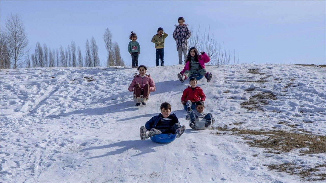 Çocuklardan Ebabil Aras, kar yağmasının ardından plastik bidonlarla kaydıklarını söyledi.