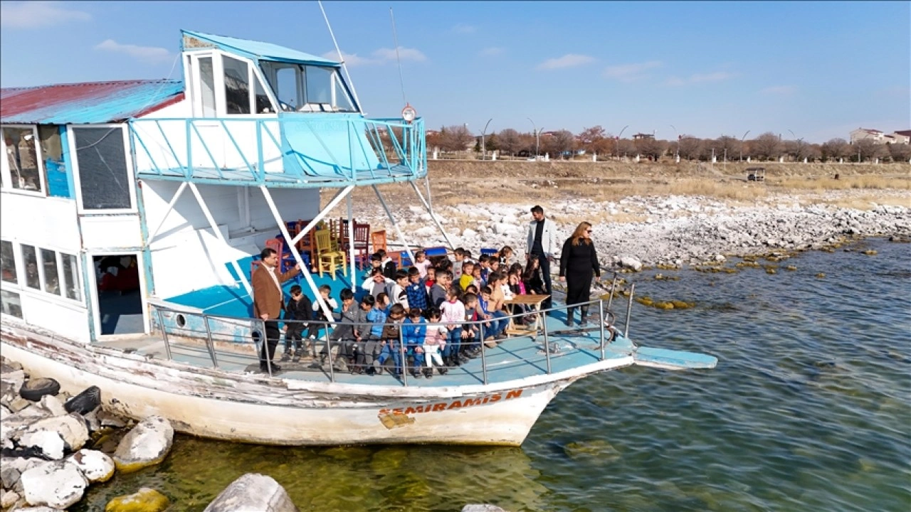 Çevre bilinci kazanmaları amacıyla önce Van Gölü kıyısında öğretmenleriyle temizlik yapan öğrenciler, daha sonra teknedeki programa katıldı.