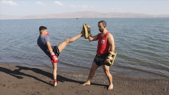 Muay thai ve Kick Boks Milli Takım Antrenörü Sinan Ağlar'ın kontrolünde her gün Van Gölü'nde ve kumsalda antrenman yapan Denizci, suda koşarak bacaklarını güçlendiriyor.